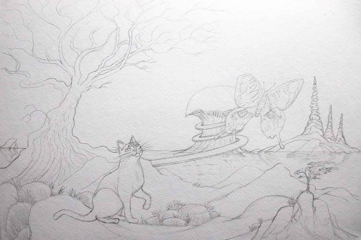 This water color painting was inspired by the death of my father on Wednesday April 8 12:24pm. I decided to turn my emotions and grief into creativity and funnel all of my energy, focus and inspiration into this painting, inspired by Roger Dean. This was the first painting I had done in about 8 years and was completed pretty quickly in under two weeks working off and on. I intentionally didn’t want to overwork it even though I easily could have. I wanted there to be some space and levity but clearly a trifecta of imagery unfolding in a visual story.